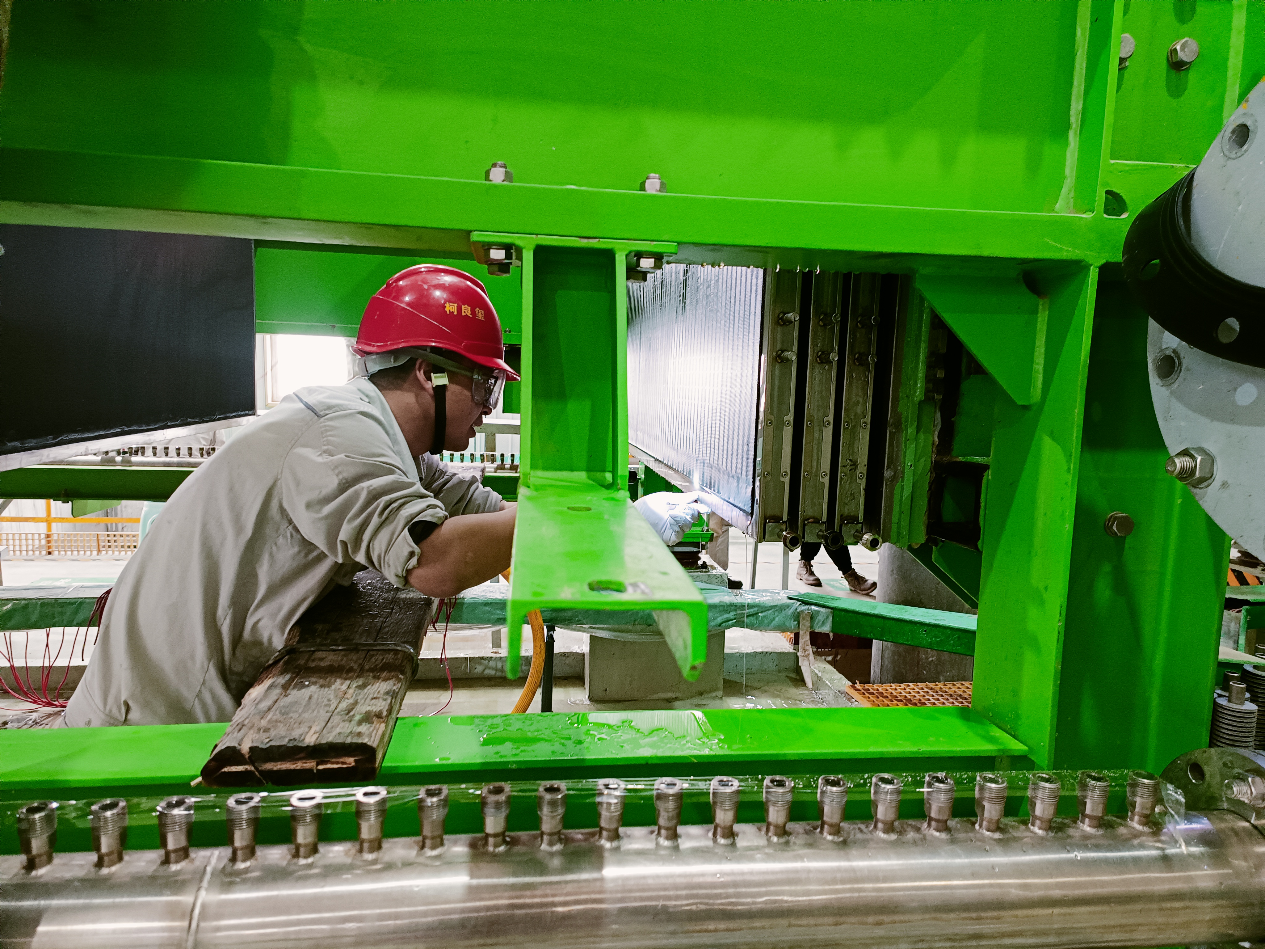 每次檢修到上拉桿,就是我們干的最起勁的時候,這不僅僅預示著電解槽檢修接近尾聲,更是一種間接鍛煉身體的方法,你們看像我這樣啊,一二一二……,上拉桿的時候,檢修人員都非常用力去緊拉桿,確保檢修期間的安全。在電槽檢修,更換離子膜單元槽片之后,至少要上三遍拉桿,就力道而言,第一遍較為輕松,二遍其次,最后一遍最為考驗檢修人員臂力和耐力,多次的手臂揮動、機械重復,力量要到位,在拉緊拉桿的過程中我們往往都是汗流浹背、滿頭大汗、氣喘吁吁的,當拉上去后,總能看見他們會心一笑。
