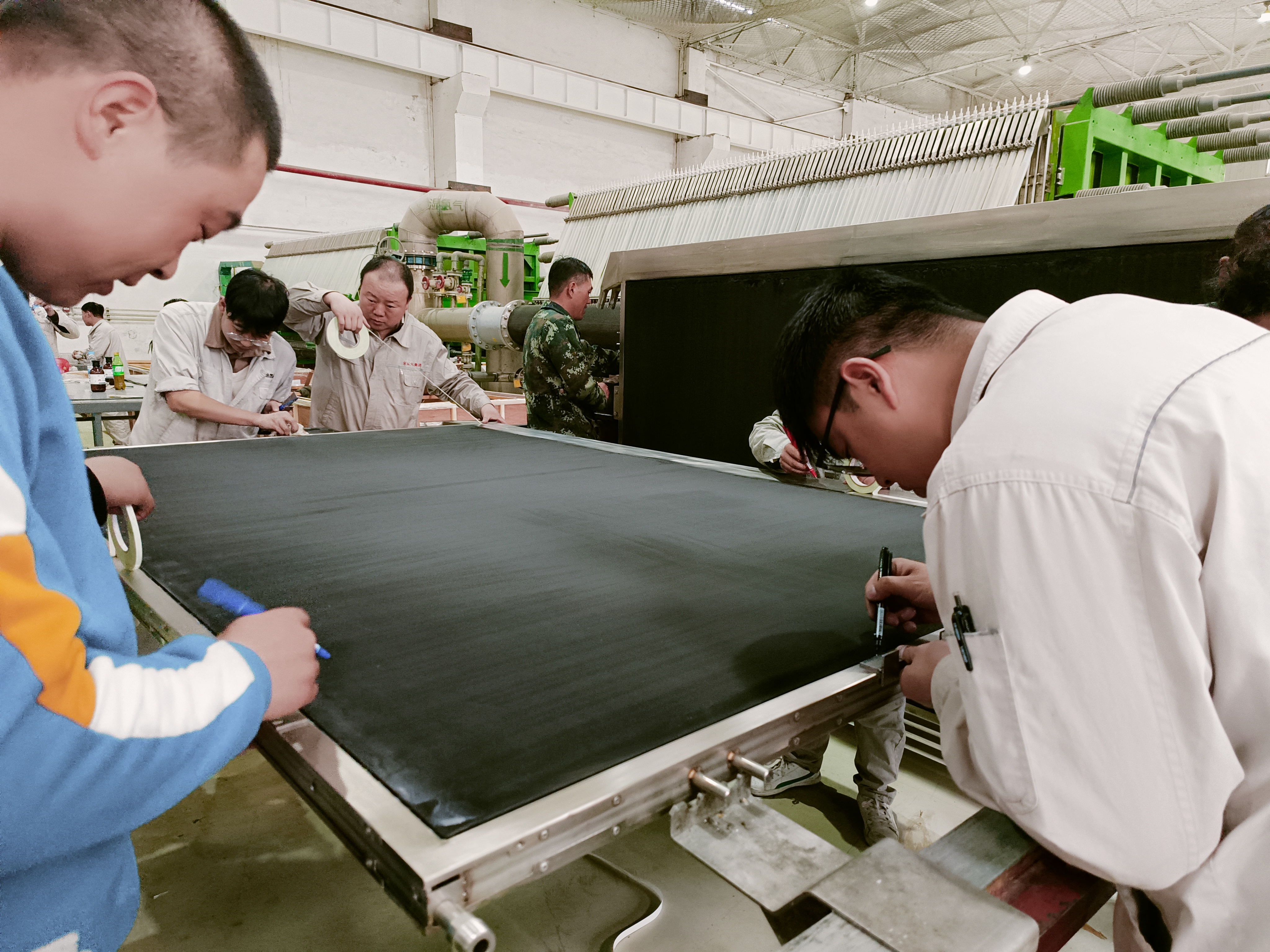 4月3號早上七點,參與電解槽檢修的全部日勤人員和運行班人員早早來到電解二樓,參加檢修前動員會,主管副經理和裝置長分別就檢修注意事項及要求做了強調。動員會結束后,參與檢修的全體人員便投入了正式的檢修作業。盧經理和李主任帶領所有的檢修人員沖鋒在一線,拆槽子、扯墊子、清理密封面、粘墊子、吊槽子、抹硅脂、裝膜每一個作業環節離不開他們的身影,缺不了他們的耐心指導,只為了電解槽的檢修能夠更加快速、高效的完成。